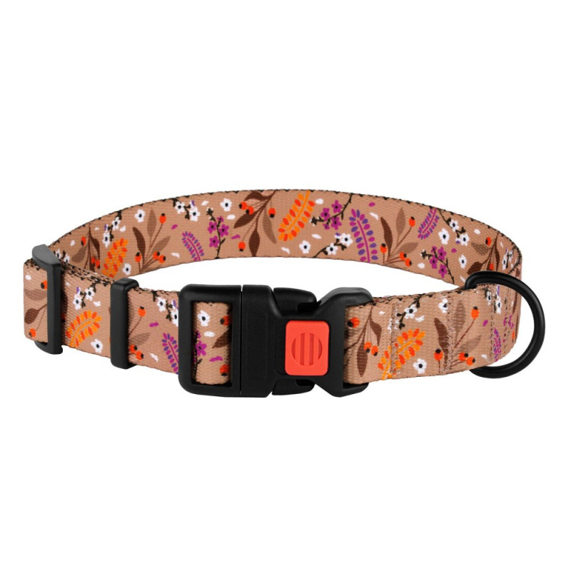 Высокопрочный нейлон бежевого цвета со цветами, из которого изготовлен ошейник, не теряет цвет при стирке и не выгорает на солнце.